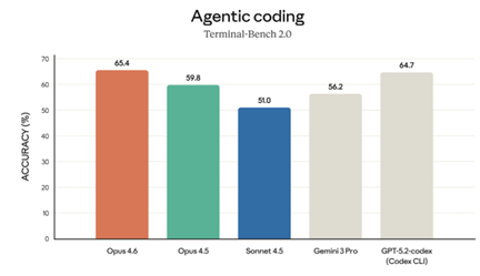 Claude Opus 4.6はAnthropicのフラッグシップモデルで性能が大幅に強化された。その中で、プログラムをコーディングする機能が格段に向上し、業界でトップの性能に達した(下のグラフ)。Opus 4.6はAIエージェントに特化したモデルで、ソフトウェア開発ではコーディング・エージェント「Claude Code」として使われる。モデルが自律的に長時間にわたりプログラミングすることができる。複数のAIエージェントが作業分担して大規模なシステムを開発する。Claude Codeはソフトウェア開発部門の技術者のように、共同作業で巨大プロジェクトを実行する。