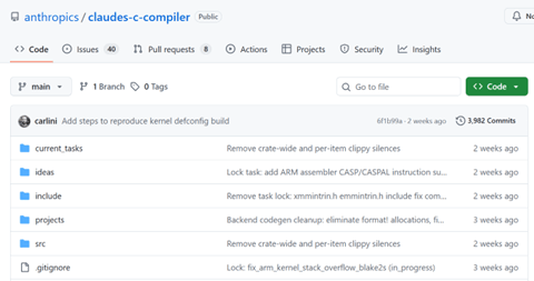 AnthropicはOpus 4.6を使ってCコンパイラを開発し、その成果をオープンソースとして公開した(下の写真、ソースコードをGitHubに公開)。コンパイラとはソースコード(コマンド、人間が理解できるテキスト)をプロセッサ(CPUなど)の機械命令に変換するモデルを指す。ソフトウェア開発における基盤技術で、このケースでは「Rust」という言語を使って、基本ソフト「Linux」をコンパイルする「Cコンパイラ (Claude Code Compiler、CCC)」を開発した。完成したコンパイラは10万行の大規模システムで、「Linux 6.9」のカーネルを異なるアーキテクチャ(Intel x86、ARM、RISC-V)向けにコンパイルすることに成功した。