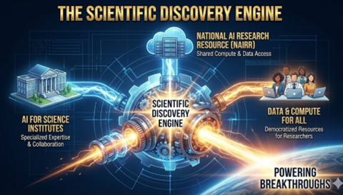 大統領令はこのミッションを支えるプラットフォーム「American Science and Security Platform」を構築することを求めている。プラットフォームはスーパーコンピューターやAIエージェントなどから構成され、科学基礎研究のエンジン「Scientific Discovery Engine」を支える(下の写真)。プラットフォームの構成要素は: