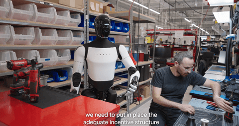 オプティマスはテスラの製造工場「ギガ・テキサス」に導入されクルマの製造を実行している。マスクは自動車の製造ラインで人間に代わりオプティマスを導入し、製造ラインを自動化する構想を示している。また、オプティマスは他の製造企業でも導入され、社員が3-5台のロボットを使って作業すると予測する。また、消費者向けには各家庭が1台のロボットを所有する時代が始まると述べている。マスクはヒューマノイド・ロボットの販売台数はスマートフォンを上回り巨大産業になるとのビジョンを示している。(下の写真、製造工場でオプティマスが作業員をアシストする)